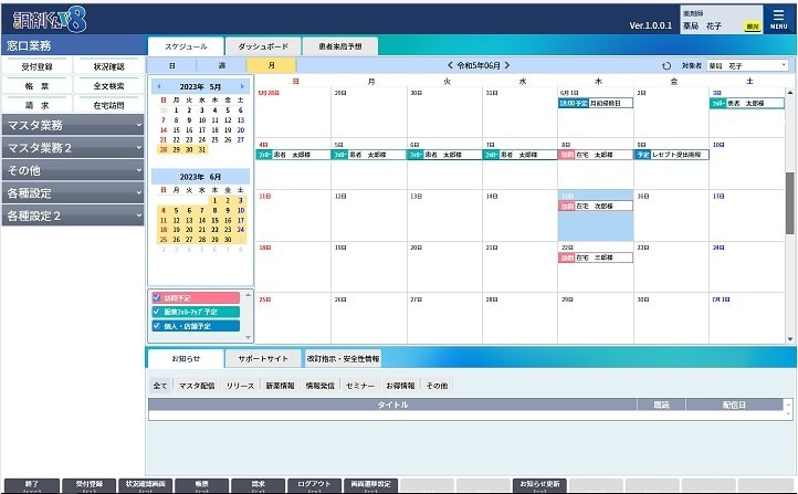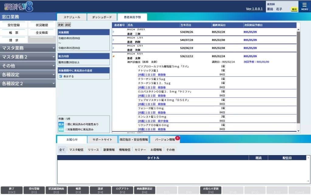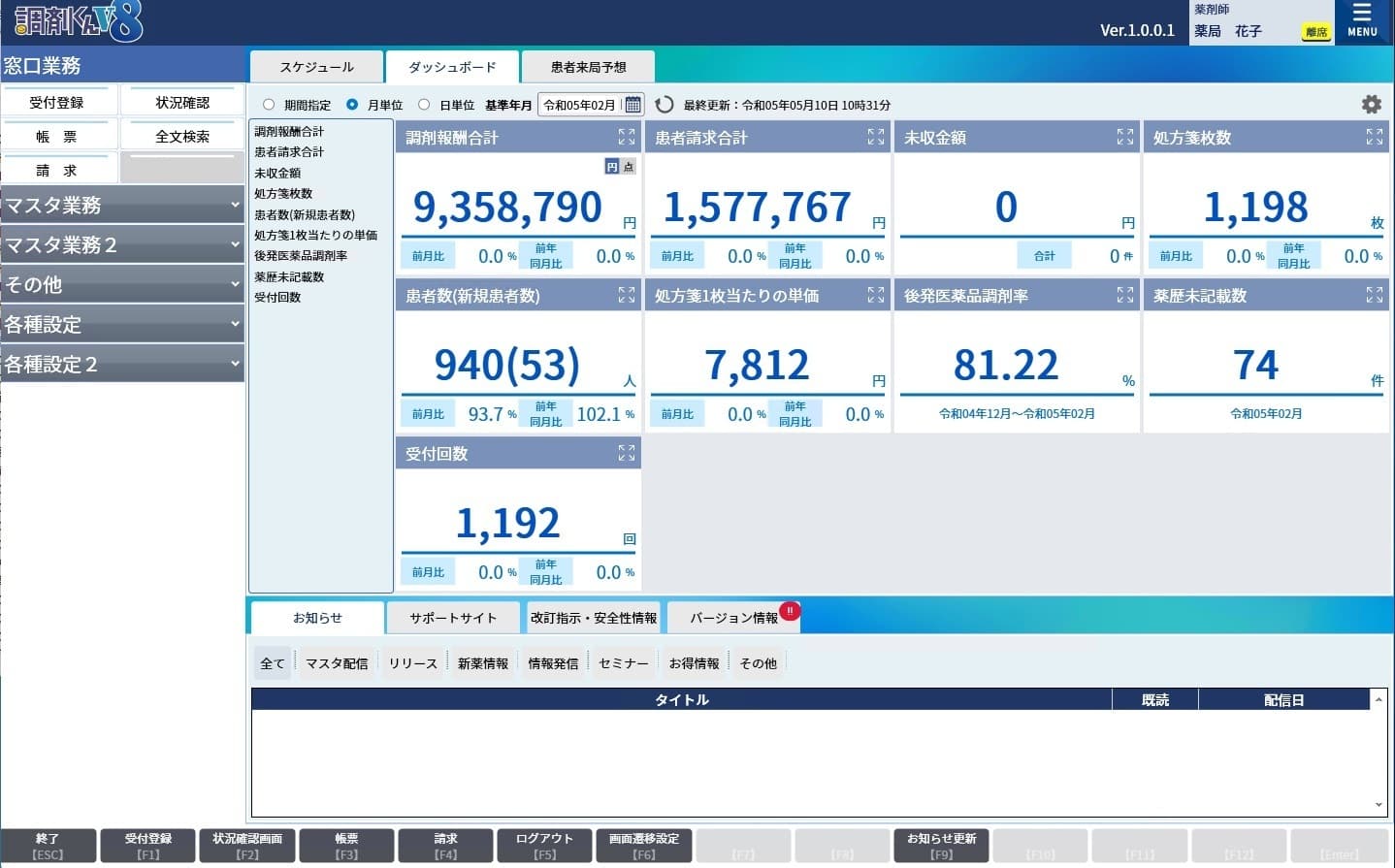 ダッシュボード表示を利用することにより本部で各店舗の日計、月計、来局患者数及びレセプト請求の実行状況等の経営データが面倒な操作なしに瞬時に確認、閲覧すすことができます。